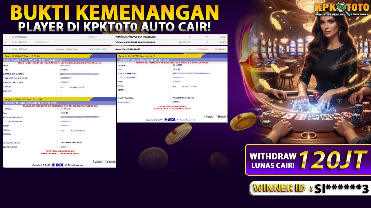 Bandar togel KPKTOTO merupakan bandar togel dan slot online yang membayar semua kemenangan member hingga lunas. Setiap pembayaran pada situs kami dilakukan dengan cara transfer ke rekening tujuan yang sudah di daftarkan pada situs togel online kami, Pembayaran hanya dapat di proses jika rekening yang di daftarkan telah valid dan dapat di transfer. Semua kemenangan member yang mendapatkan hadiah jackpot terbesar akan kami posting agar semua pemain dapat melihat bandar situs terpercaya KPKTOTO ini membayar semua kemenangan member hingga lunas. Setiap postingan yang kami posting akan kami lakukan sensor pada nomor rekening 4 digit dan nama rekening untuk menjaga privasi dan kerahasiaan member. Postingan Jackpot yang kami posting agar member atau pemain yang belum pernah bermain bisa melihat bandar togel Bukan Kaleng Kaleng Seperti KPKTOTO ini, Semua postingan jackpot yang kami posting dapat di lihat data keasliannya melalui nomor reff yang di tunjukan pada bank atau mbanking saat kita melakukan transfer.