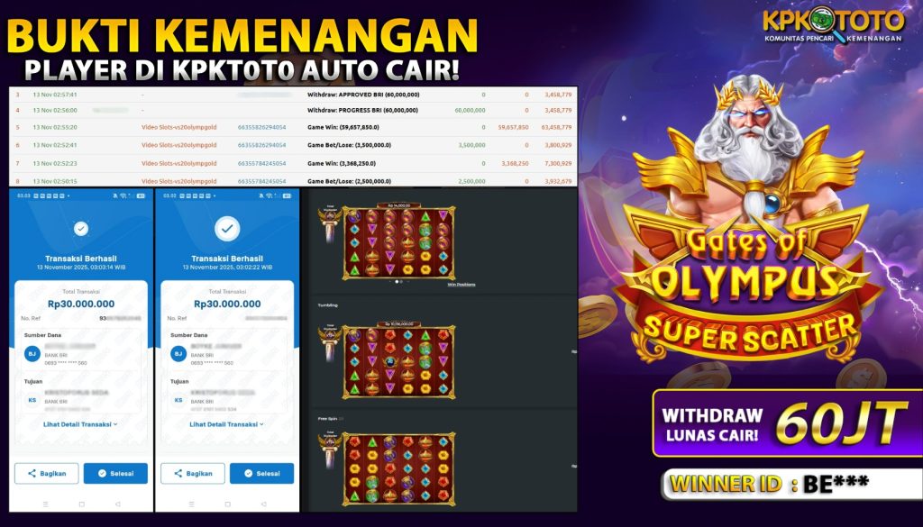 Bukti Kemenangan 13 NOVEMBER 2025 Di PRAGMATIC PLAY GATES OF OLYMPUS SUPER SCATTER WD 60 Juta